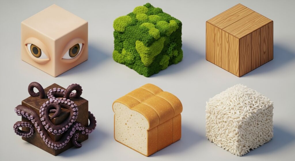 素材系、装飾系、変わり種など多種多様なキューブがあります。